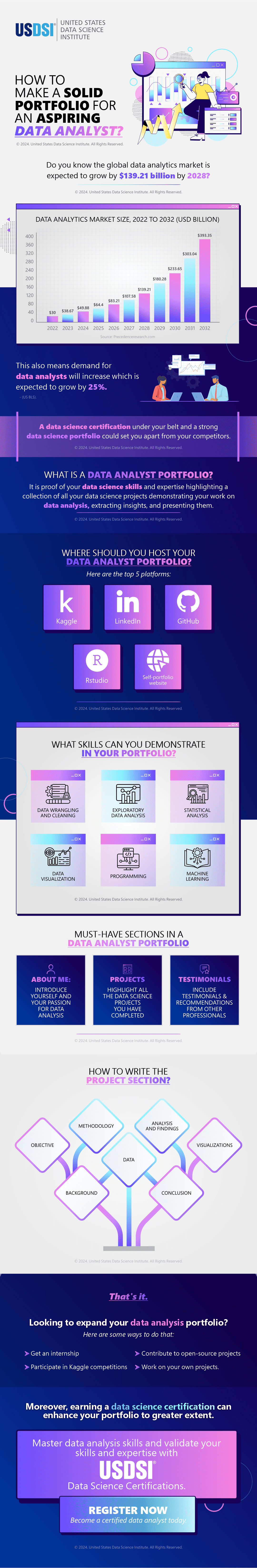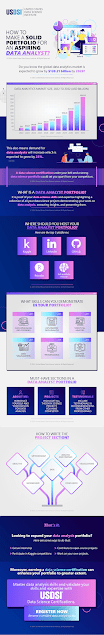 Then check out USDSI’s comprehensive infographic guide on data analyst portfolios. Here we discuss what a data analyst portfolio is, what important sections you must have in your portfolio, which are the best platforms to host your portfolio, and other important aspects of the same.